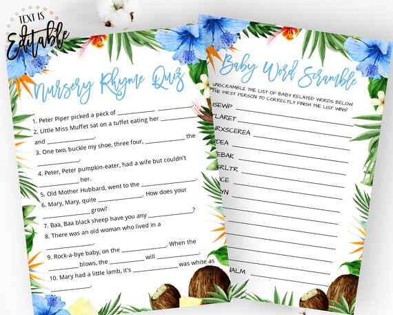 Blue Aloha Baby Shower Games Nursery Rhyme Quiz Baby Word Etsy